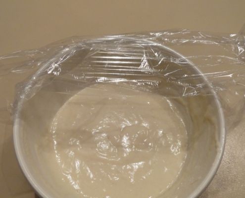 Prepariamo il fermento: mettiamo in una ciotola la farina con il lievito e l’acqua, mescoliamo bene, chiudiamo con la pellicola e aspettiamo sino a che avrà raddoppiato il volume.