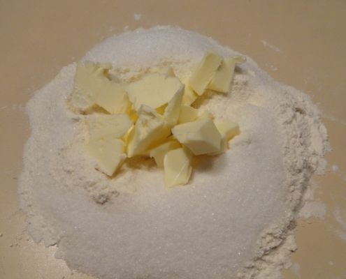 Mettiamo sul tavolo le farine a fontana, il burro, lo zucchero e un pizzico di sale, uniamo il fermento e incominciamo ad impastare.
