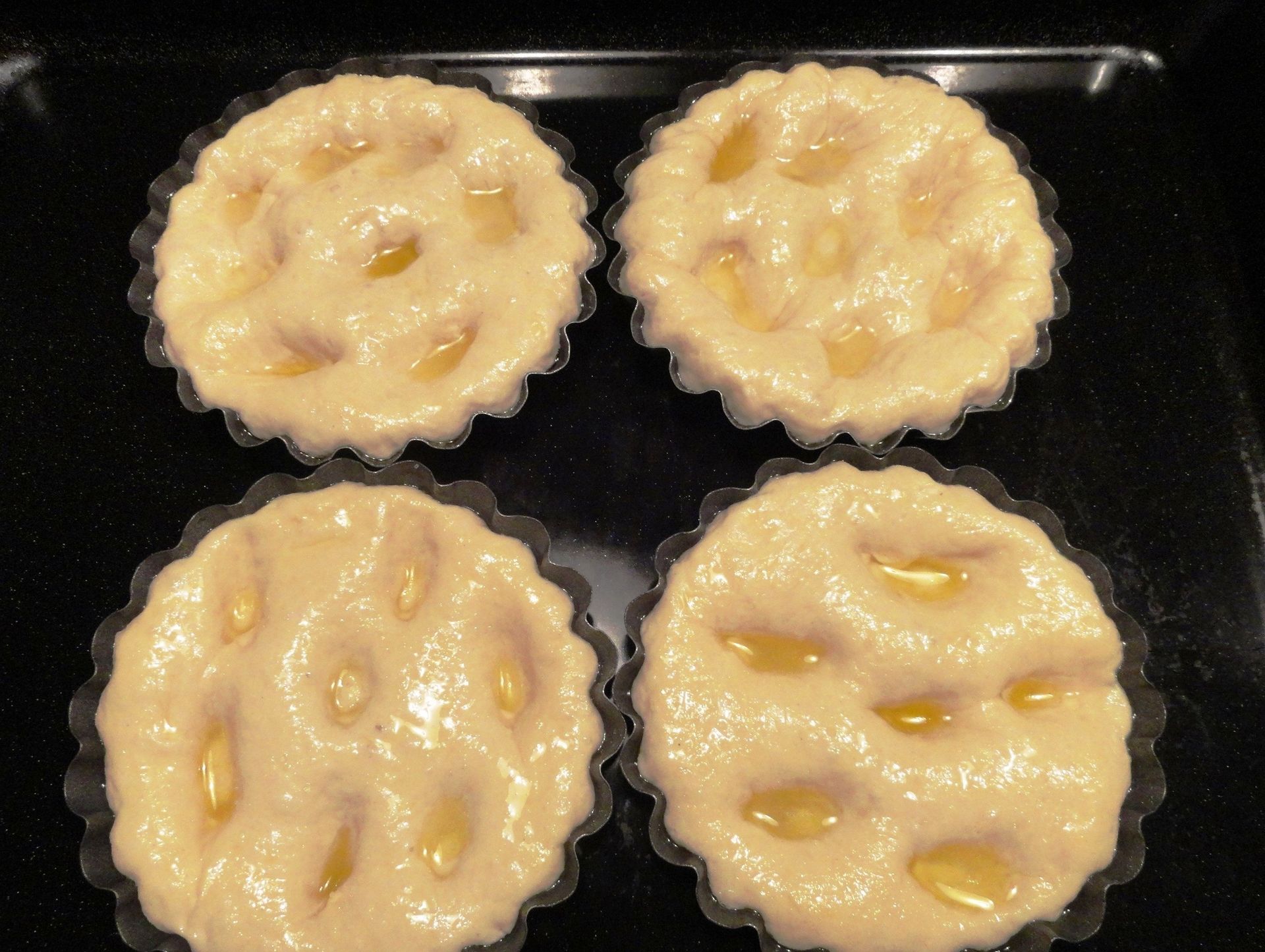 Riprendiamo l’impasto lievitato lo dividiamo e stendiamo la pasta con le mani formando le focaccine, ungiamo bene le formine con l’olio, appoggiamo la pasta stesa e la lasciamo nuovamente lievitare coperta per circa 1 ora.